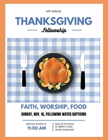 This year we are excited to combine our annual Thanksgiving Fellowship with Baptism Sunday Service. Make note of the time we'll be starting, 11:00 am. Be sure to invite someone, sign up in the foyer to bring a dish or two, and be ready to celebrate all the bountiful blessings of our Lord and Savior! Everyone is welcome, we just need to know you're coming to prepare enough!